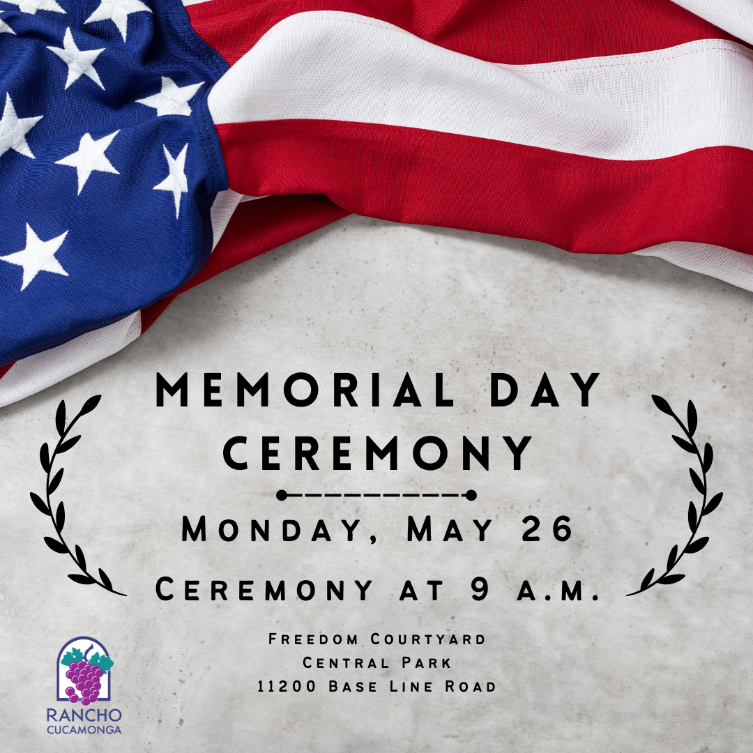 The City of Rancho Cucamonga will honor and remember those who gave the ultimate sacrifice serving in our Armed Forces on Monday, May 26. The ceremony will take place at Central Park, Freedom Courtyard at 9:00 a.m. Light refreshments will be available prior to the ceremony.