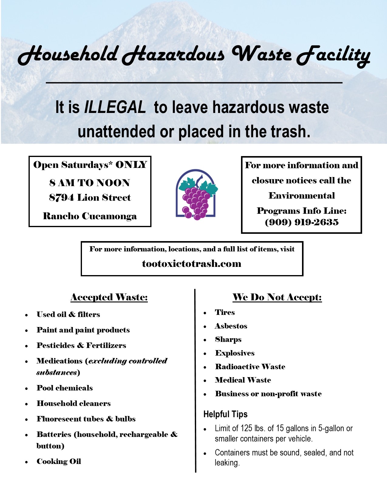 The Rancho Cucamonga Household Hazardous Waste Facility is open every Saturday from 8:00 a.m. to 12:00 p.m., except on holiday weekends.
