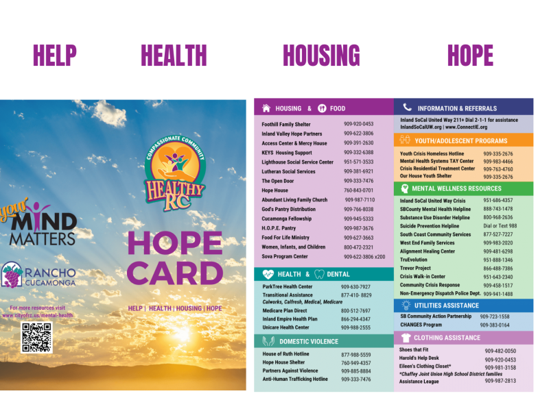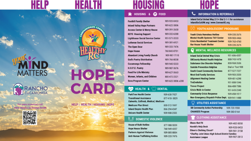 Whether you're navigating challenges, or simply seeking way to improve your mental health, you are not alone. The City of Rancho Cucamonga and the Healthy RC Mental Health Subcommittee are committed to providing resources and opportunities for connection because “Your Mind Matters.”