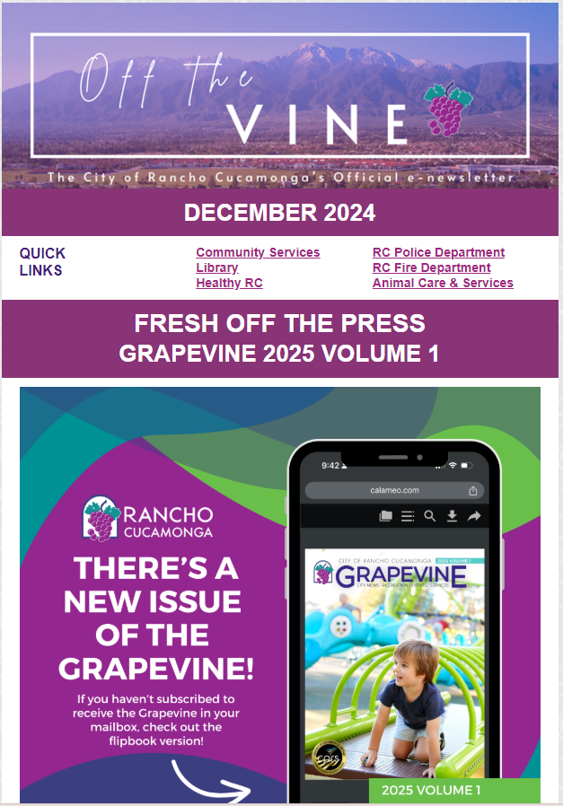 Be sure to read our December newsletter HERE for City of Rancho Cucamonga news and updates. If you're not already a subscriber, sign up for the City of Rancho Cucamonga eNews HERE.