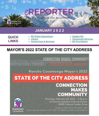 Be sure to read our January newsletter HERE for City of Rancho Cucamonga news and updates. If you're not already a subscriber, sign up for the City of Rancho Cucamonga eNews HERE.