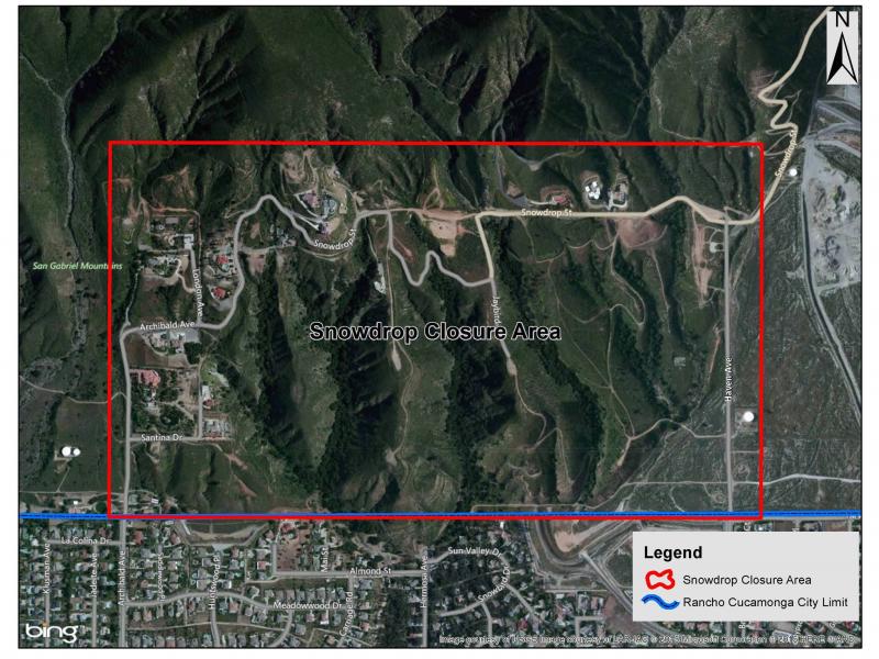 Due to increased fire danger, the Rancho Cucamonga Fire Protection District will be implementing a closure of Snowdrop/Santina Street over the 4th of July holiday. The closure is being implemented under the authority of the Fire Chief pursuant to Rancho Cucamonga Fire Protection District Ordinance FD-058 to provide for public safety and prevent the ignition of a wildfire due to dangerous fire conditions and past use of illegal fireworks in the area by non-residents.