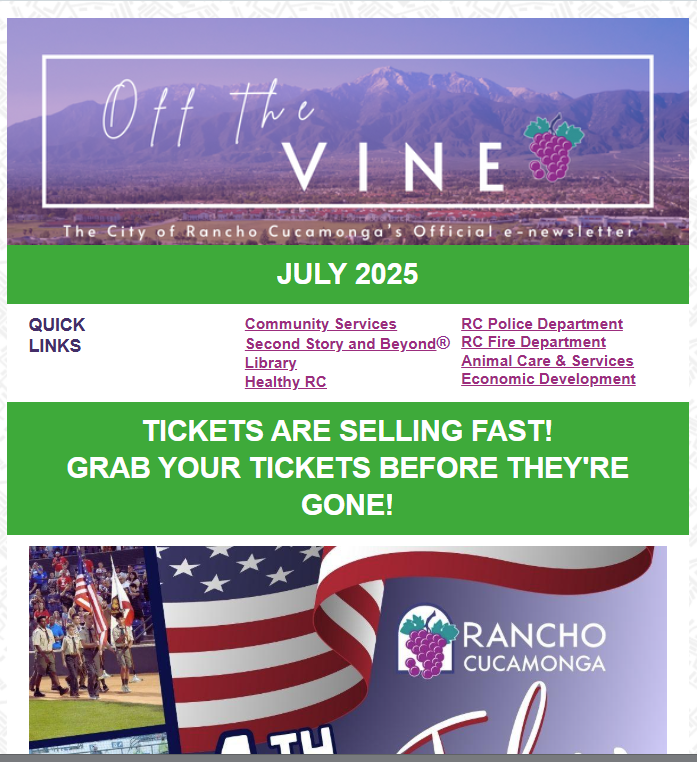 Be sure to read our July newsletter HERE for City of Rancho Cucamonga news and updates. If you're not already a subscriber, sign up for the City of Rancho Cucamonga eNews HERE.