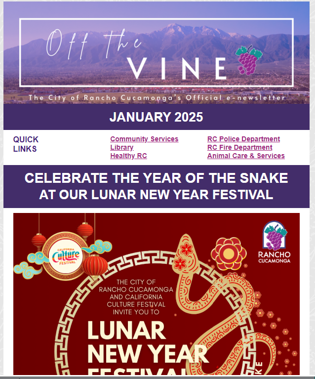 Be sure to read our January newsletter HERE for City of Rancho Cucamonga news and updates. If you're not already a subscriber, sign up for the City of Rancho Cucamonga eNews HERE.