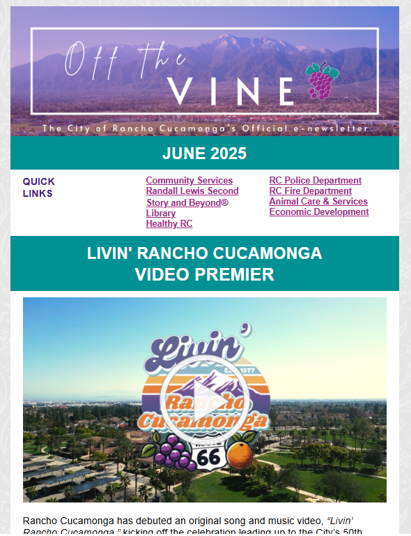 Be sure to read our June newsletter HERE for City of Rancho Cucamonga news and updates. If you're not already a subscriber, sign up for the City of Rancho Cucamonga eNews HERE.