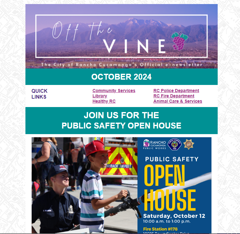 Be sure to read our October newsletter HERE for City of Rancho Cucamonga news and updates. If you're not already a subscriber, sign up for the City of Rancho Cucamonga eNews HERE.